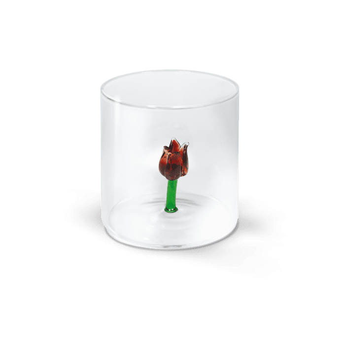 Bicchiere in vetro borosilicato con soggetto in vetro colorato all’interno. Decoro Tulipano.